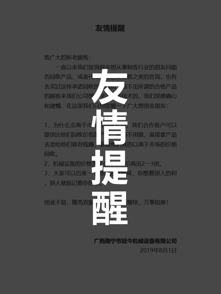 購(gòu)買(mǎi)冠今制香機(jī),享受八大保證,讓您創(chuàng)業(yè)無(wú)憂(yōu)!冠今制香機(jī)八大支持保證系統(tǒng):強(qiáng)力支持 后顧無(wú)憂(yōu) 1.現(xiàn)場(chǎng)觀(guān)摩:免費(fèi)在制香廠(chǎng)里參觀(guān)各種香生產(chǎn)流程,滿(mǎn)意后再做決定。 2.專(zhuān)業(yè)培訓(xùn):購(gòu)制香機(jī)...